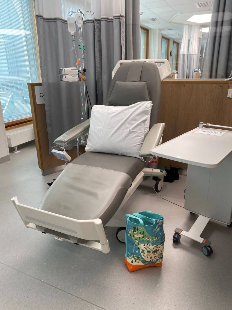 Hoitotuoli ja hoitopaikka Syöpäkeskuksen lääkehoitoyksikössä näytti tältä.